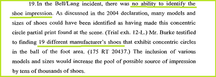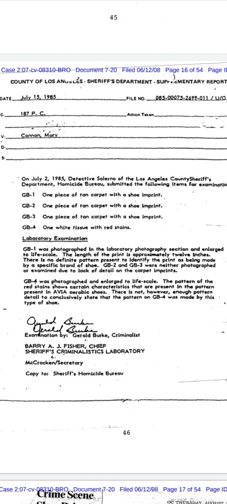 “In the Cannon incident, Mr. Burke testified that a partial shoe impression in carpet was made by a right Avia Aerobic shoe. (175 RT 20406.) He did not go to the scene, but the section of carpet was brought to him at the laboratory. (175 RT 20405.) Burke admitted that by the time he got the carpet sample he was unable to observe any specific pattern. (175 RT 20407.) In a written report prepared by Mr. Burke, dated July 15, 1985, (see exh. 1, Burke’s one-page report attached to the supplemental declaration) regarding his examination of three carpet samples through GB-3), bearing impressions collected from the Cannon scene, he stated as to GB-l(tria1 exh. 19 D-I), “There is no definite pattern present to identify the print as being made by a specific brand of shoe. [Carpet samples] GB-2 and GB-3 were neither photographed nor examined due to lack of detail on the carpet imprints.” (See exh. I.) However, by the time of trial he had made an identification of one of the carpet impressions as a right Avia Aerobic shoe”. (175 RT 20407.)