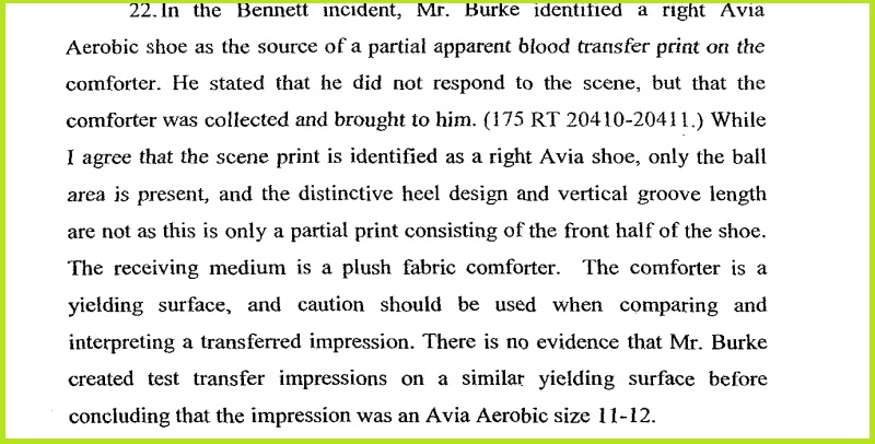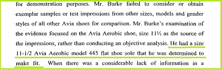 Retained as an expert witness for the prosecution, his testimony regarding shoe print evidence contributed to the misconception that only one pair of Avia shoes could have made the impressions. Burke, after comparing 97 brands, determined that the prints were made by an Avia shoe, size 11-12, and after a visit to Avia HQ, announced it was model 445b.