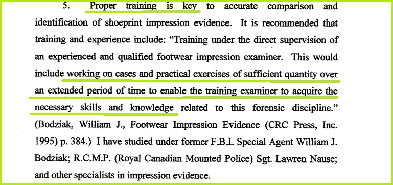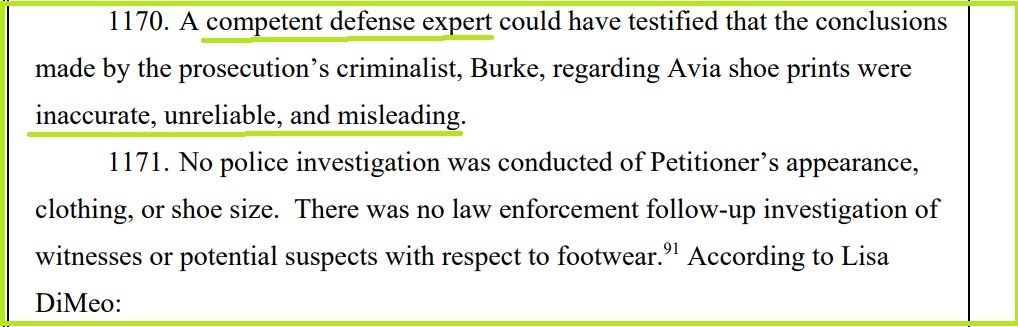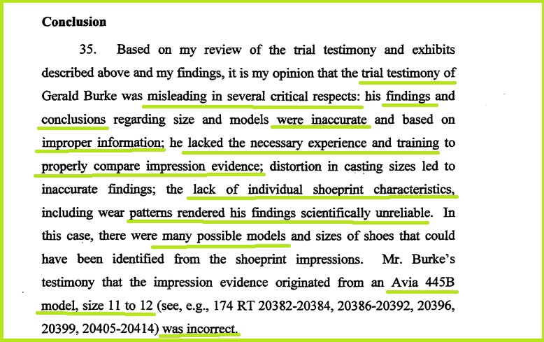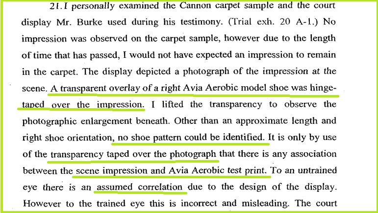 The finding of expert witness and forensic specialist Lisa DiMeo refutes the prosecution about the incidents detailed above. Her expert testimony cannot be disregarded and shows conclusively that misinformation was deliberately introduced and fed to the jury in the increasingly circus-like atmosphere both inside and outside the court. Gerald Burke had neither the experience nor training to compare footprints and impressions. The casting impressions were distorted, measurements incorrectly obtained, and the lack of individual print characteristics rendered the prosecution findings scientifically unreliable and unsafe.