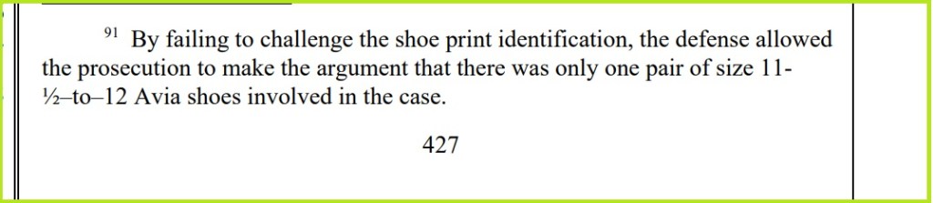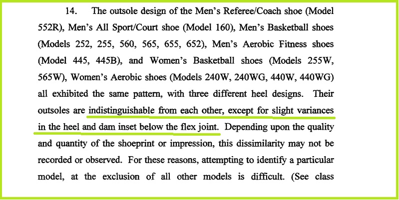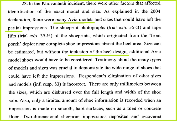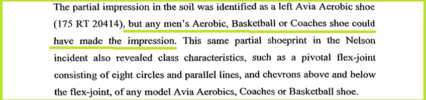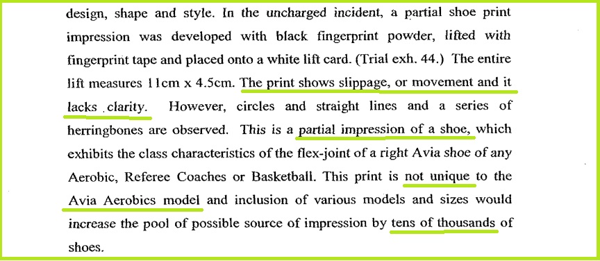 “The court display (trial exh. 20 A- I) also showed a photograph of a partial print on a white facial tissue. The print consisted of eight short parallel lines, none exceeding one inch in length, and two “V” shaped patterns. Gerald Burke testified that a left Avia Aerobic shoe was the source of the partial print on the tissue based upon his observation of the eight straight lines and chevron pattern. (175 RT 20408.) Based on my review of the evidence, the eight lines could be part of the pivotal flex-joint design, which is not exclusive to the Avia Aerobic model, and is in fact present on all men’s Coaches and Basketball models, as well as several women’s Avia shoe models”.