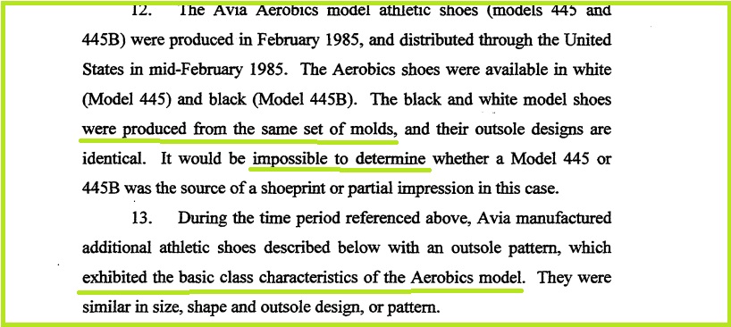 Furthermore, Avia Footwear data processing manager, Jeff Brewer, testified in court that in Southern California, from January to July 1985, twenty-four pairs of Avia shoes, model 445b, were sold. Of these, only one pair was size 11 1/2, and black. This information led the jury to believe that only one pair of shoes in Southern California could have made those impressions and prints. This was simply not true. In addition, Jerry Stubblefield, designer of the Avia aerobic shoe, misled the jury into believing that the soles of models 445 and 445b were different. Both Brewer and Stubblefield were themselves mislead by Carrillo telling them that the man he was hunting wore black sneakers, when he had no evidence of that.