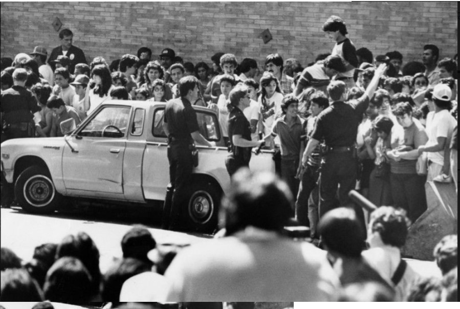 “Nite [sic] Stalker vigil at LAPD’s Hollenbeck. Crowd on St. Louis St. being pushed back by LAPD officers to across the street and onto First St. for crowd control by the police station where the night stalker suspect was moved from.” Additional photograph caption reads, “After the capture, crowds surged around Hollenbeck station in East Los Angeles to catch a glimpse of the Night Stalker.”