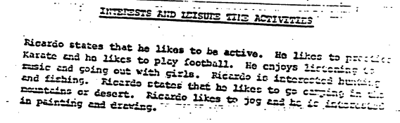 “Ricardo states that he likes to be active. He likes to practice Karate and he likes to play football. He enjoys listening to music and going out with girls. Ricardo is interested in hunting and fishing. Ricardo states that he likes to go camping in the mountains or desert. Ricardo likes to jog and he is interesting in painting and drawing.”