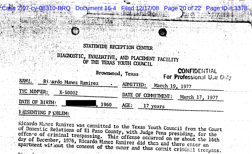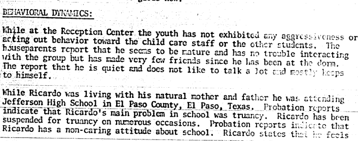 The purpose of reform schools that existed in the 1970’s in the United States was rehabilitation. We don’t know much about what happened during the time Richard spent at El Paso House. His records from the time he spent there may be unavailable because he was a juvenile or the records may be amongst the thousands of documents submitted along with his 2008 federal writ of habeas corpus petition but are sealed for some reason, so we don’t have access to them.