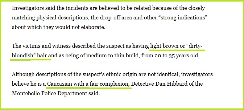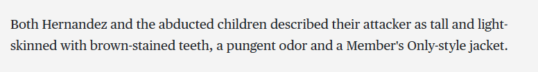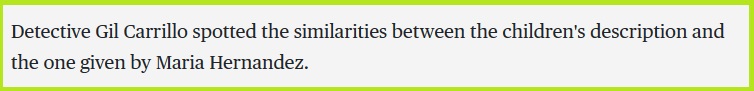 The CBS News article focuses on the old platitude that the child victims and Maria Hernandez closely described the same attacker. Truly a lightbulb moment for one person.
