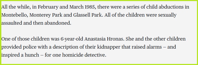 4. This is what I never understood about the Mei case. Normally criminals escalate. So why did he supposedly stab, rape and string up a little girl in 1984, then by 1985, you’re meant to believe he’s molesting/raping and releasing them. Carrillo must have felt so vindicated that his nonsense abductor theory ‘came true’ with the Mei case.