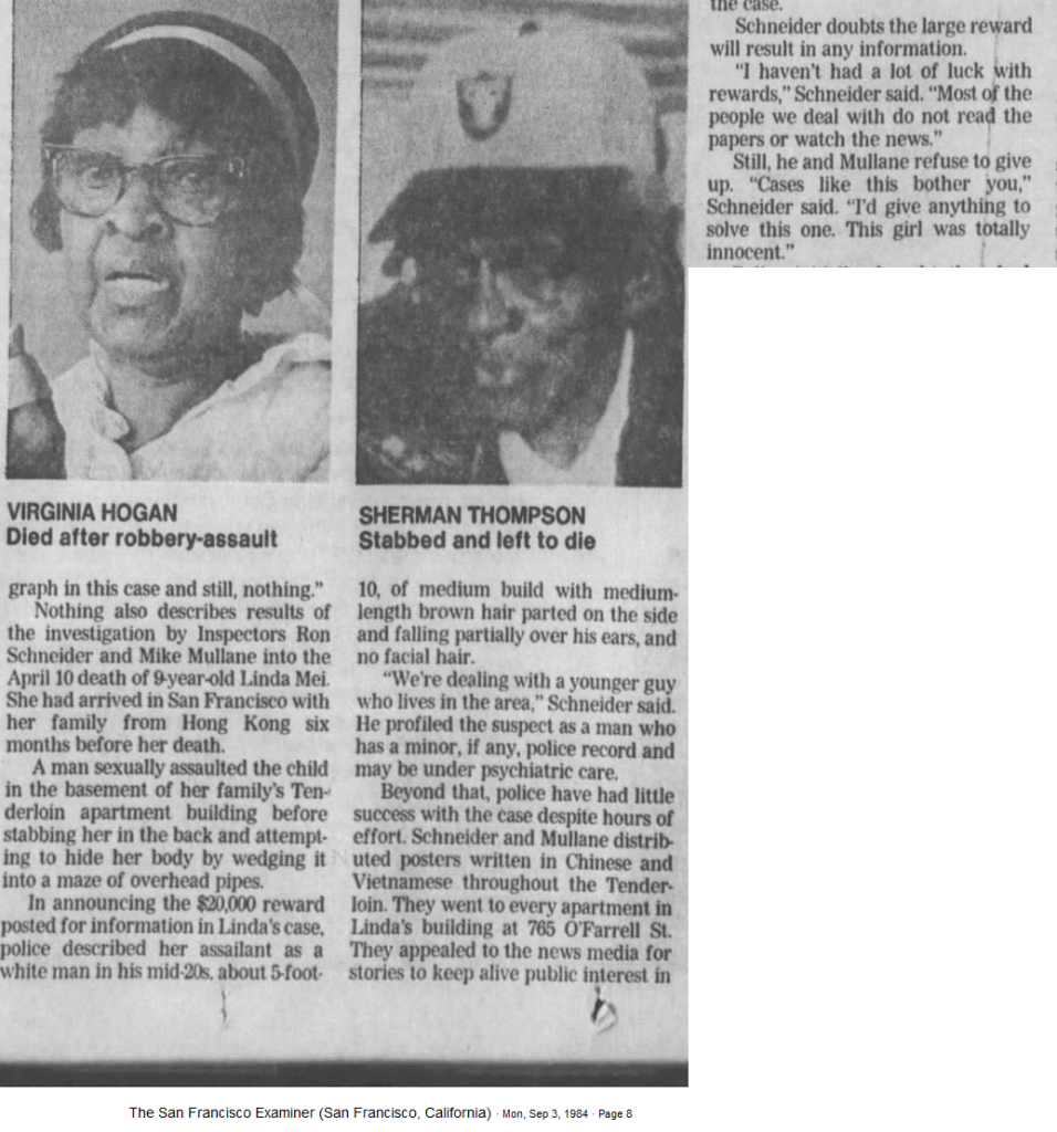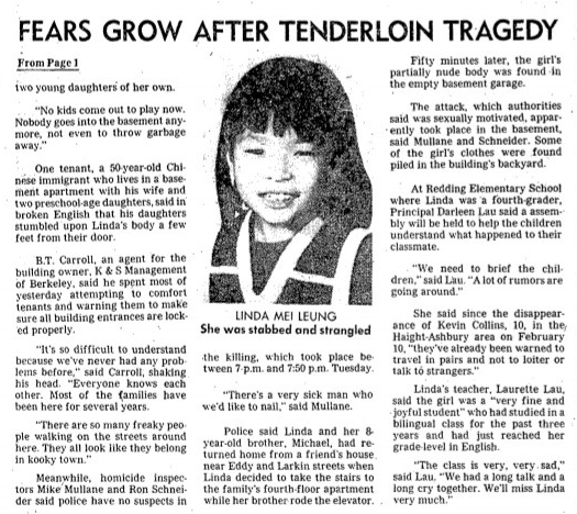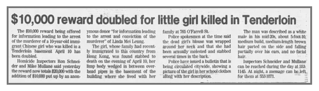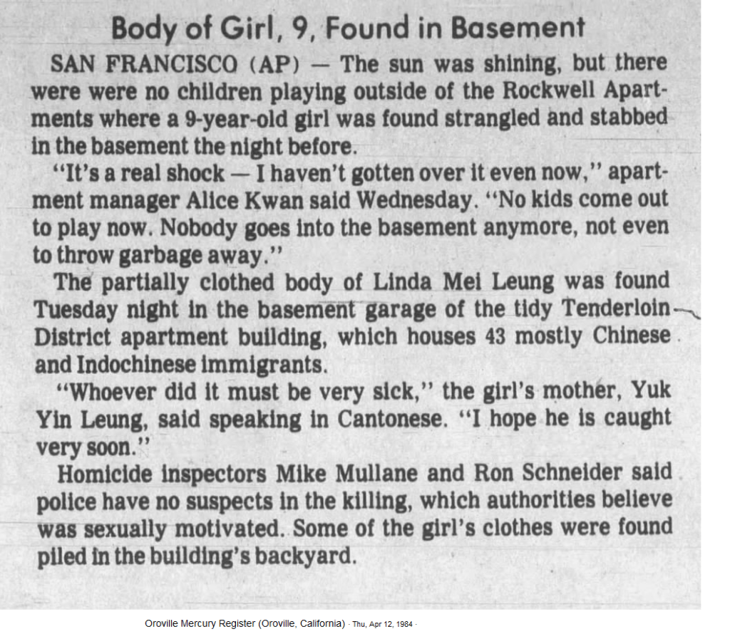 One particular San Francisco case that was not tied to Ramirez at the time was the murder of nine-year-old Mei “Linda” Leung. Mei was found raped, stabbed and strangled with her blouse in the basement of a residential hotel in San Francisco’s Tenderloin district on 10th April 1984.
