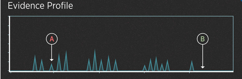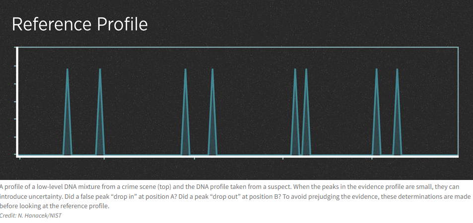 A profile of a low-level DNA mixture from a crime scene (top) and the DNA profile taken from a suspect. When the peaks in the evidence profile are small, they can introduce uncertainty. Did a false peak “drop in” at position A? Did a peak “drop out” at position B? Those factors should be assured before examining the reference profile. A single profile would have two peaks at one location; looking at the top image, we can see multiple peaks at each locus, whereby it’s safe to assume more than one person contributed to the mix.