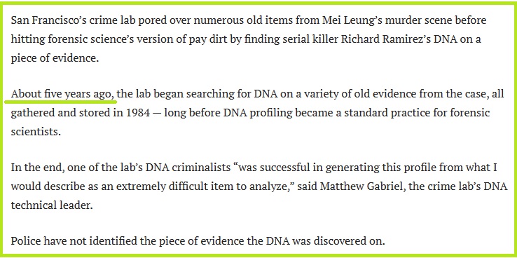 One must also ask, if the cold case detectives were so sure Ramirez was at the scene because of a DNA match – and they knew he stayed in the area – why were they appealing for informants to provide information about his whereabouts in 1984? Was that necessary? This brings us to the second part of the post: DNA evidence.
