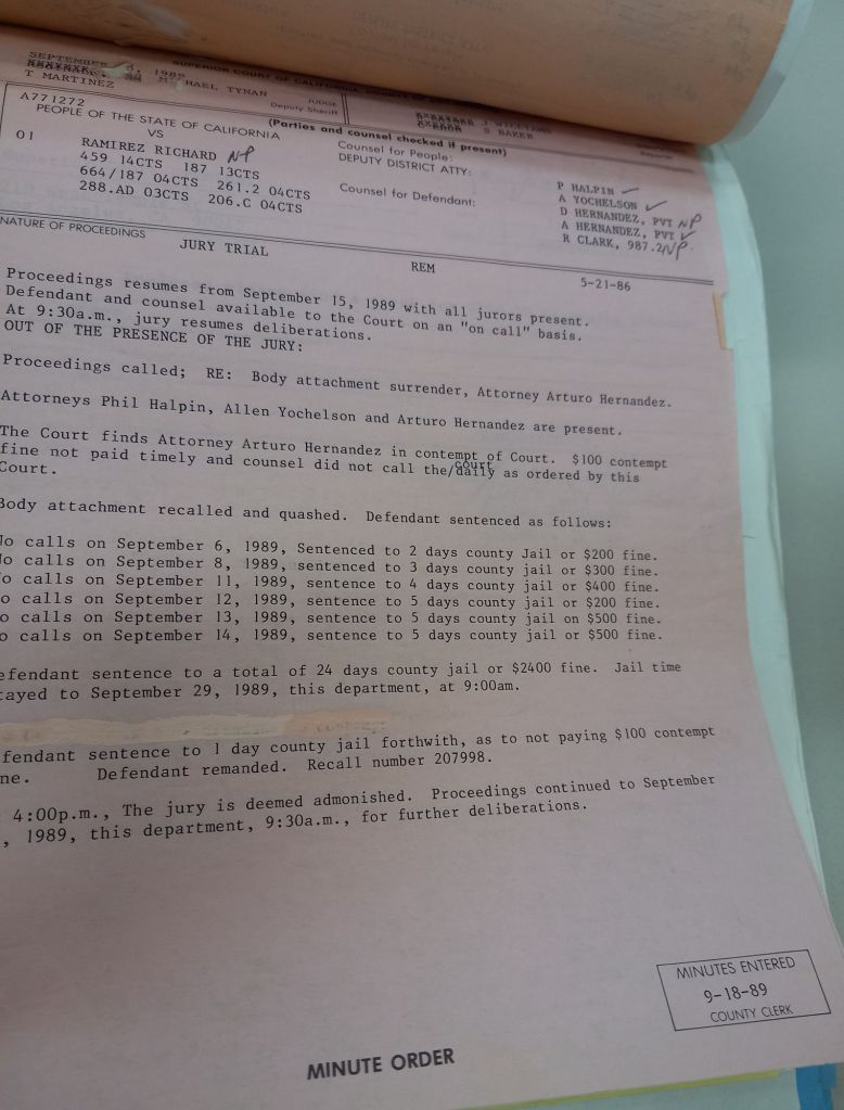 - August 18th 1989, Arturo Hernandez was found in contempt of court and fined. He had told the court he was in Mexico attending his brother’s funeral; he was in Europe on honeymoon. Trial court found him to have abandoned Ramirez.