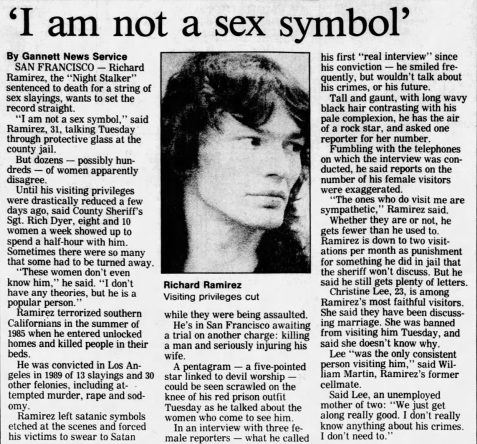While many women wrote letters to Richard and visited him, that was the extent of his relationship with most of them, as he was not allowed physical contact visits, except for Night Stalker trial juror, “Cupcake” Cindy Haden, and Doreen Lioy – who later married Richard.