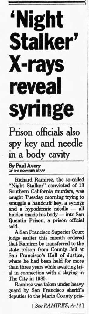 He had no phone access and was only allowed visitation through a Plexiglas window for two hours a week. He remained here until he was transferred to the San Francisco County Jail to await trial for the Pan crimes in February of 1990. He was transferred back to San Quentin on September 21, 1993, although legal proceedings had not concluded in S.F. This is because his “groupies” presented security problems. The following is from the San Francisco Examiner: