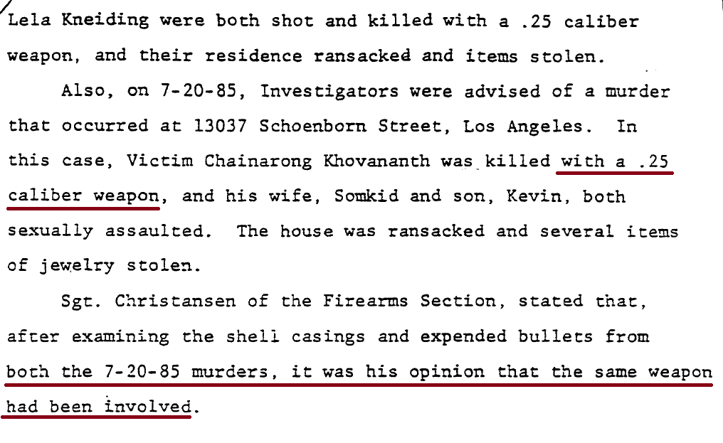 But according to the affidavit, LASD Sergeant Robert Christansen originally assessed the Khovananth bullets to have come from a .25 caliber automatic pistol. (Affidavit, document 7.4 pictured below). This meant that the guns were originally linked to the Kneiding, Petersen, Abowath, Pan and Carns attacks.