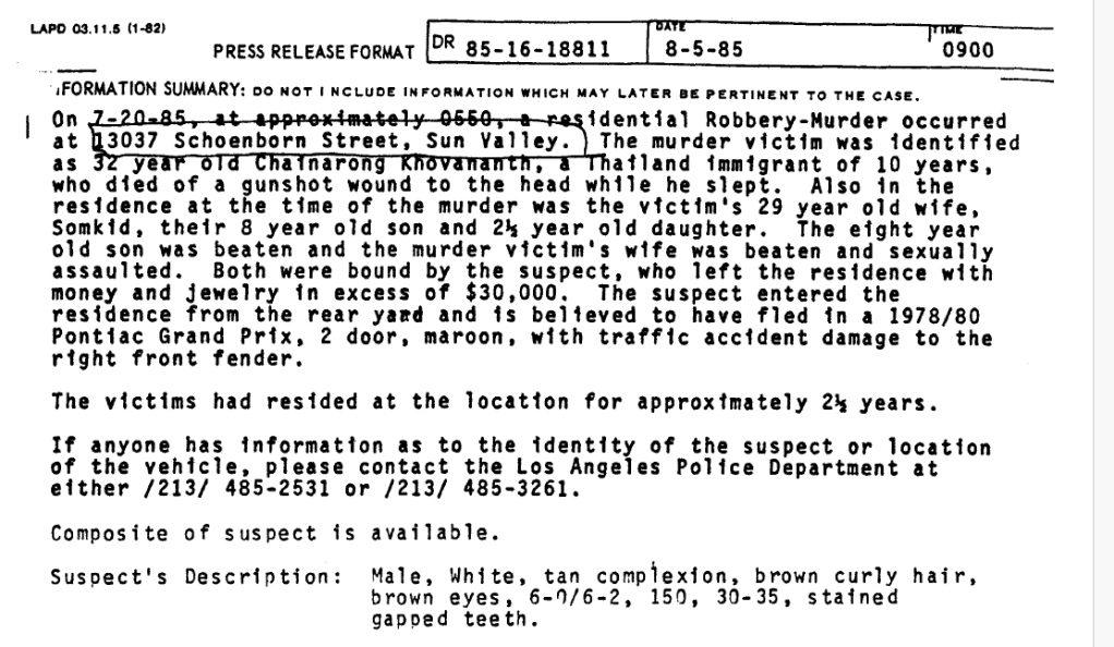 Although we do not have Somkid’s police report, we have detailed information concerning the Khovnanth incident in the 2008 Federal Petition for Writ of Habeas Corpus, including Somkid’s original description of her attacker and statements she made shortly after the crimes and in court. Below is an LAPD press release detailing the crime from Habeas document 20.3. Her police statements are not yet available.