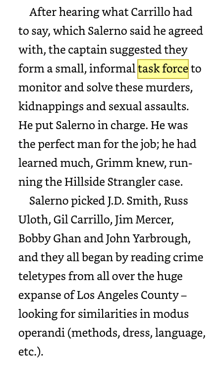 Now, Carrillo had convinced someone who would be taken seriously – Salerno already had an important role in the Hillside Strangler case. According to the biographer Philip Carlo, Salerno was made acting lieutenant for team 3. This cannot yet be verified this anywhere else, and Carlo is often inaccurate. But there it is.