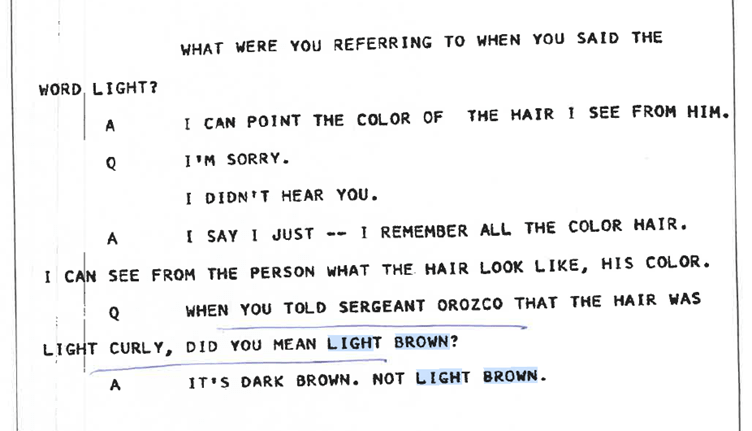 When asked to confirm that she told LAPD Sergeant Leroy Orozco that the suspect had light brown hair, Khovananth meanders off into the texture of the killer’s curls. She appears to be comparing the tight curls in her composite sketch to Richard Ramirez’s mugshot, with his loose curls. Now she claims that “light” is her word for “loose”.