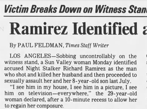 There’s also a degree of emotional control at play. Each time, Khovananth reverted to the lines she rehearsed with Philip Halpin: that she saw Richard Ramirez in her home and that he was the same man in the newspapers and on her television set. These were said in a dramatic and hysterical manner that won the sympathy of the press – who never mentioned the “light brown hair” statement. She also cried about remembering Ramirez’s “big eyeballs and rotten teeth” that played into the media image of the Night Stalker. This does not match others’ descriptions.