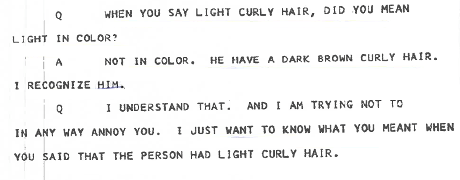 HERNANDEZ: I understand that. And I am trying not to in any way annoy you. I just want to know what you meant when you said that the person had light curly hair.
