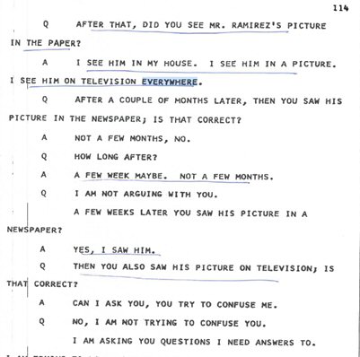 Next, Hernandez asked whether she saw Ramirez’s mugshot in the newspaper before or after his arrest. Khovananth grew confused over whether he meant the composite sketch or the real photograph. She said she remembered seeing both – first the sketch in early August, then Ramirez’s real face after the 30th. But when Hernandez asked her to confirm that she had followed newspaper coverage, she suddenly claimed she couldn’t tell the difference between drawings and photos, asking him to repeat questions as if she no longer understood English.